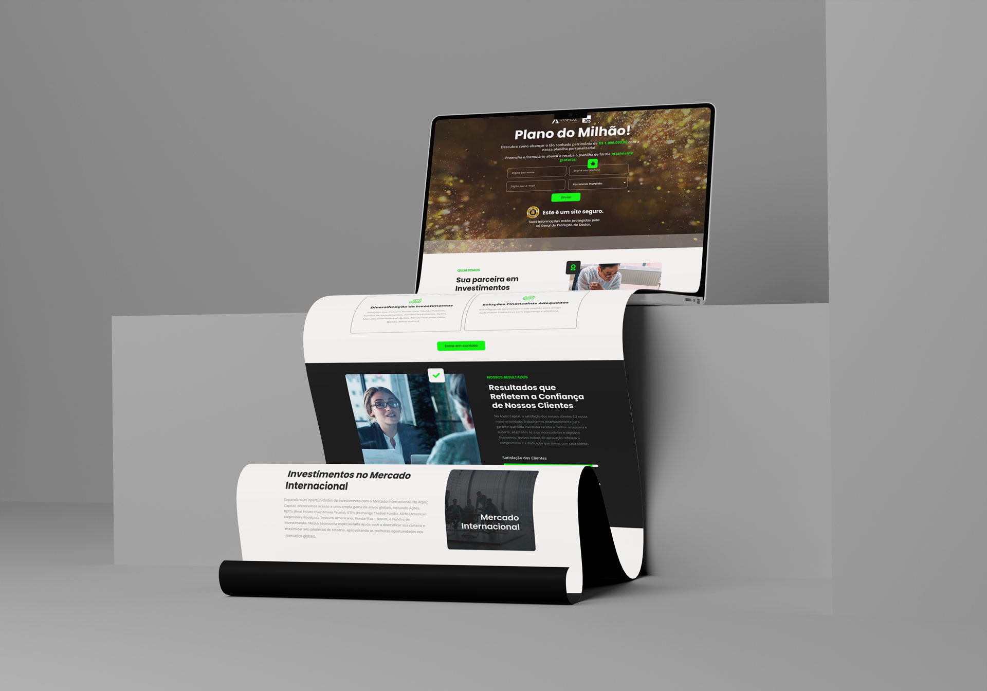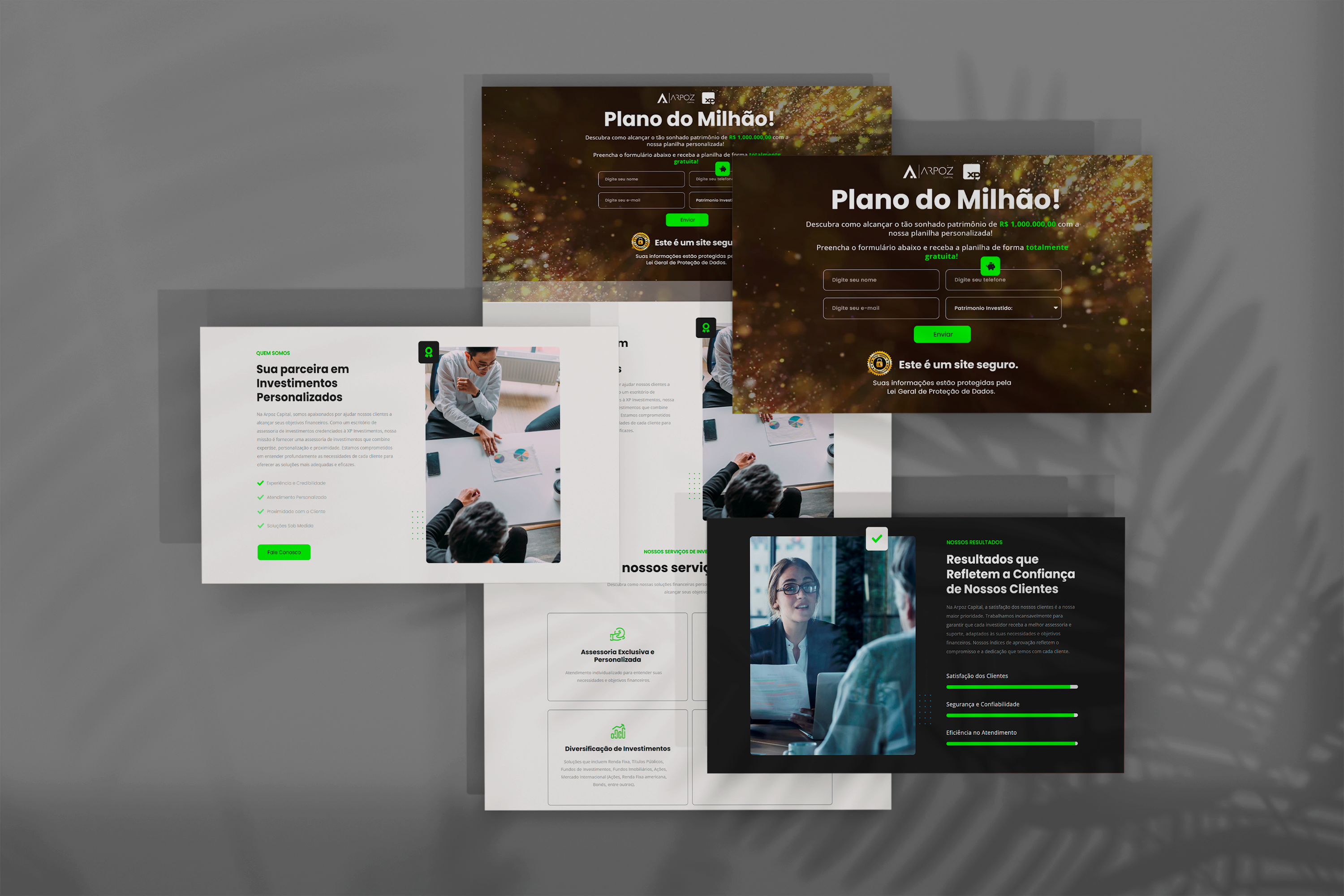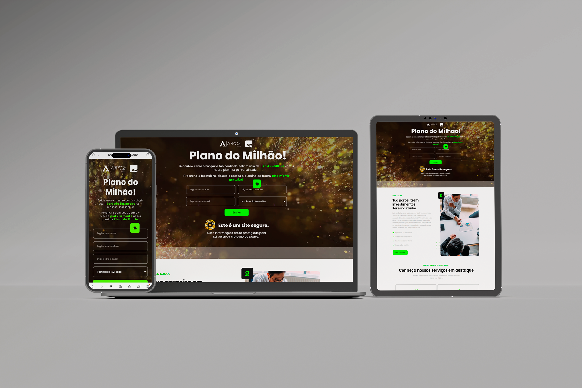 Desenvolvimento de Landing Page para captação de leads do escritório Arpoz Capital, credenciado à XP Investimentos. O projeto foi pensado para transmitir credibilidade e proximidade, destacando a expertise do time altamente qualificado da Arpoz Capital. O conteúdo e o design foram estruturados para apresentar, de forma clara, as soluções personalizadas oferecidas aos investidores, independentemente do perfil ou do valor disponível para investir, visando maximizar a conversão e gerar novas oportunidades de relacionamento.