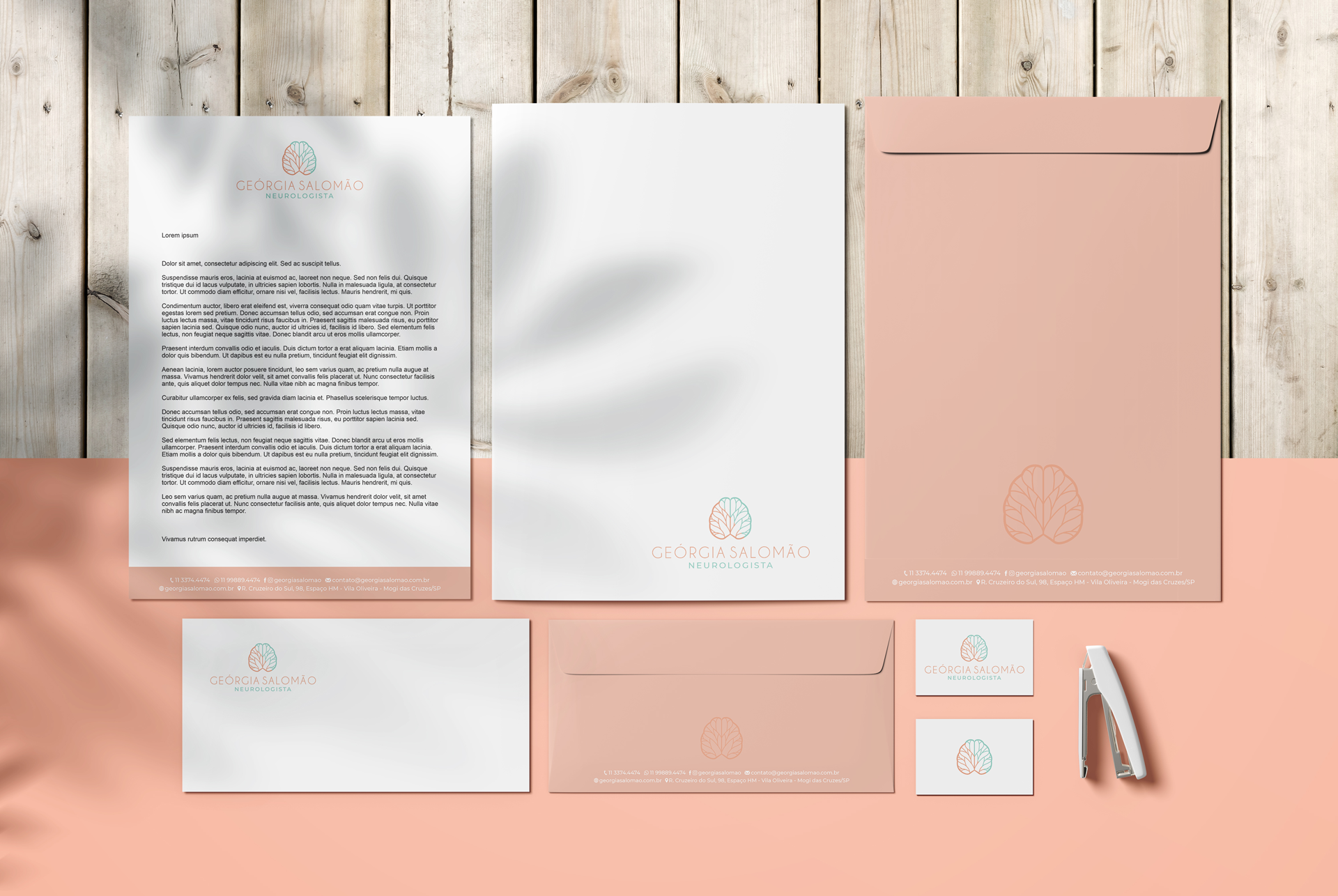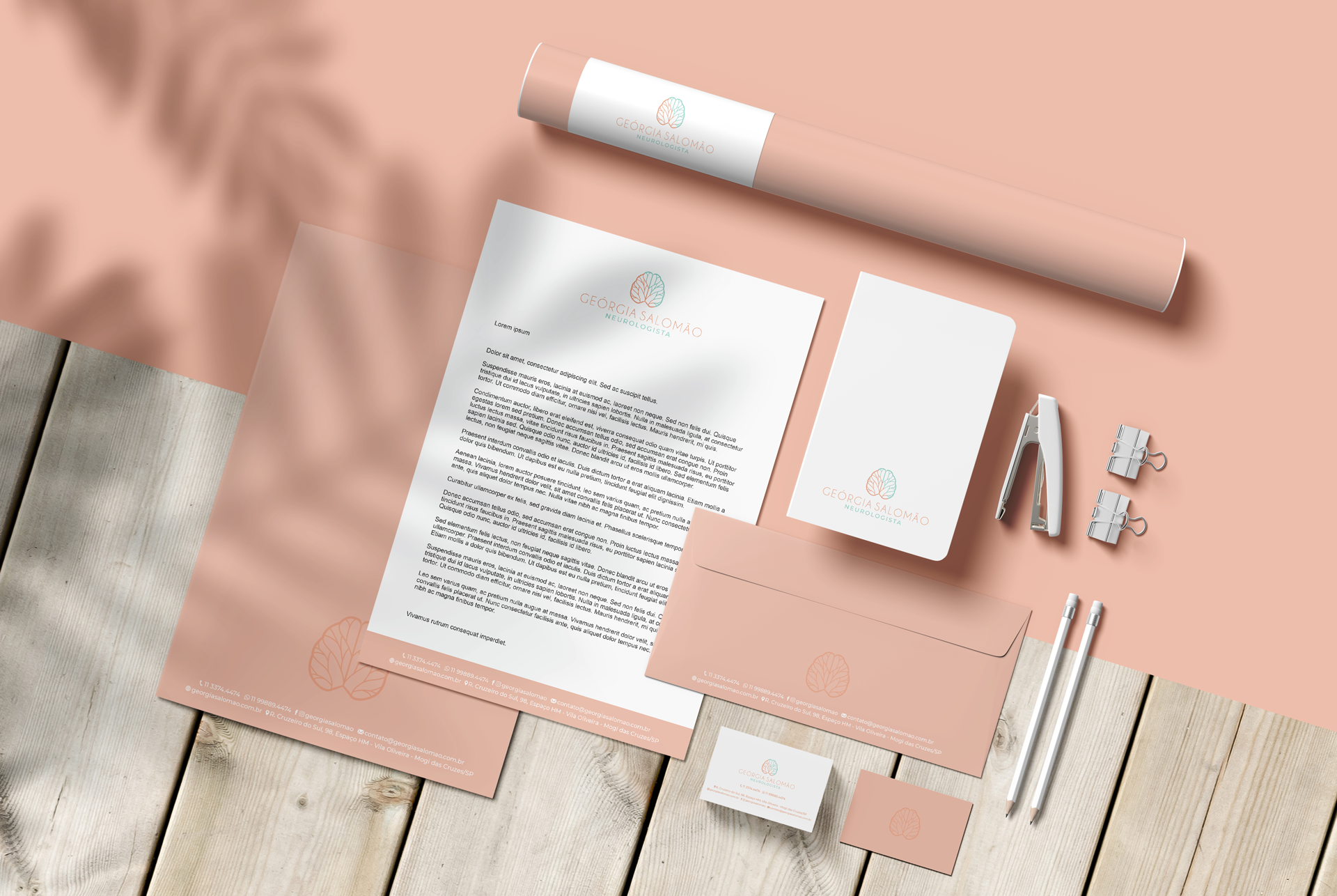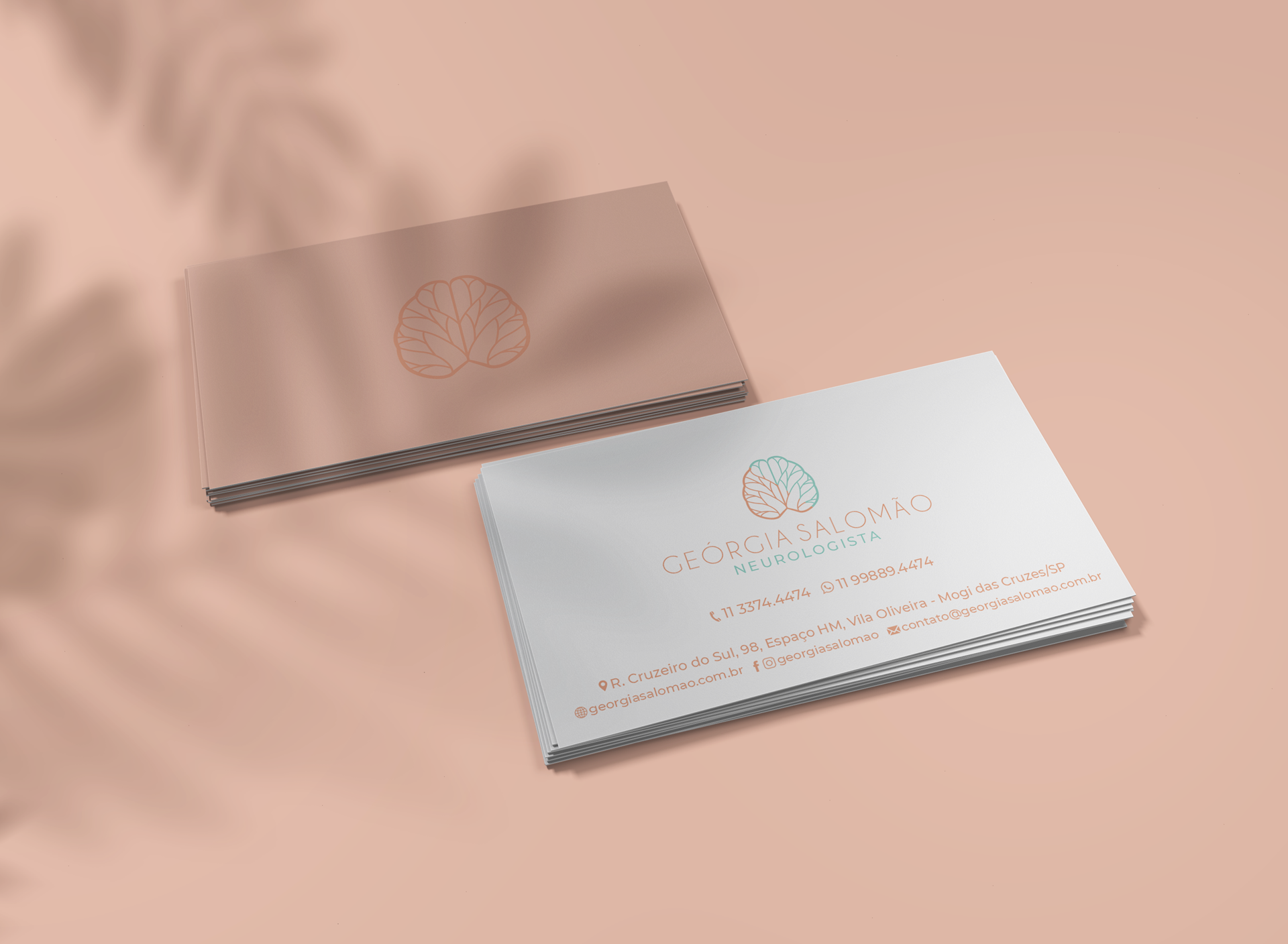 A identidade visual desenvolvida para o consultório da Dra. Geórgia Salomão é baseada em um símbolo conceitual que traduz, de forma sutil e harmoniosa, os pilares de sua atuação profissional. A marca une três elementos simbólicos: o cérebro, que representa diretamente a especialidade da neurologia; a folha, como símbolo de vitalidade e renovação; e o coração, que remete à vida e ao amor pela profissão. Esses componentes se fundem em um ícone gráfico único e abstrato, transmitindo sensibilidade, cuidado e conhecimento técnico, pilares do atendimento oferecido pela Dra. Geórgia.