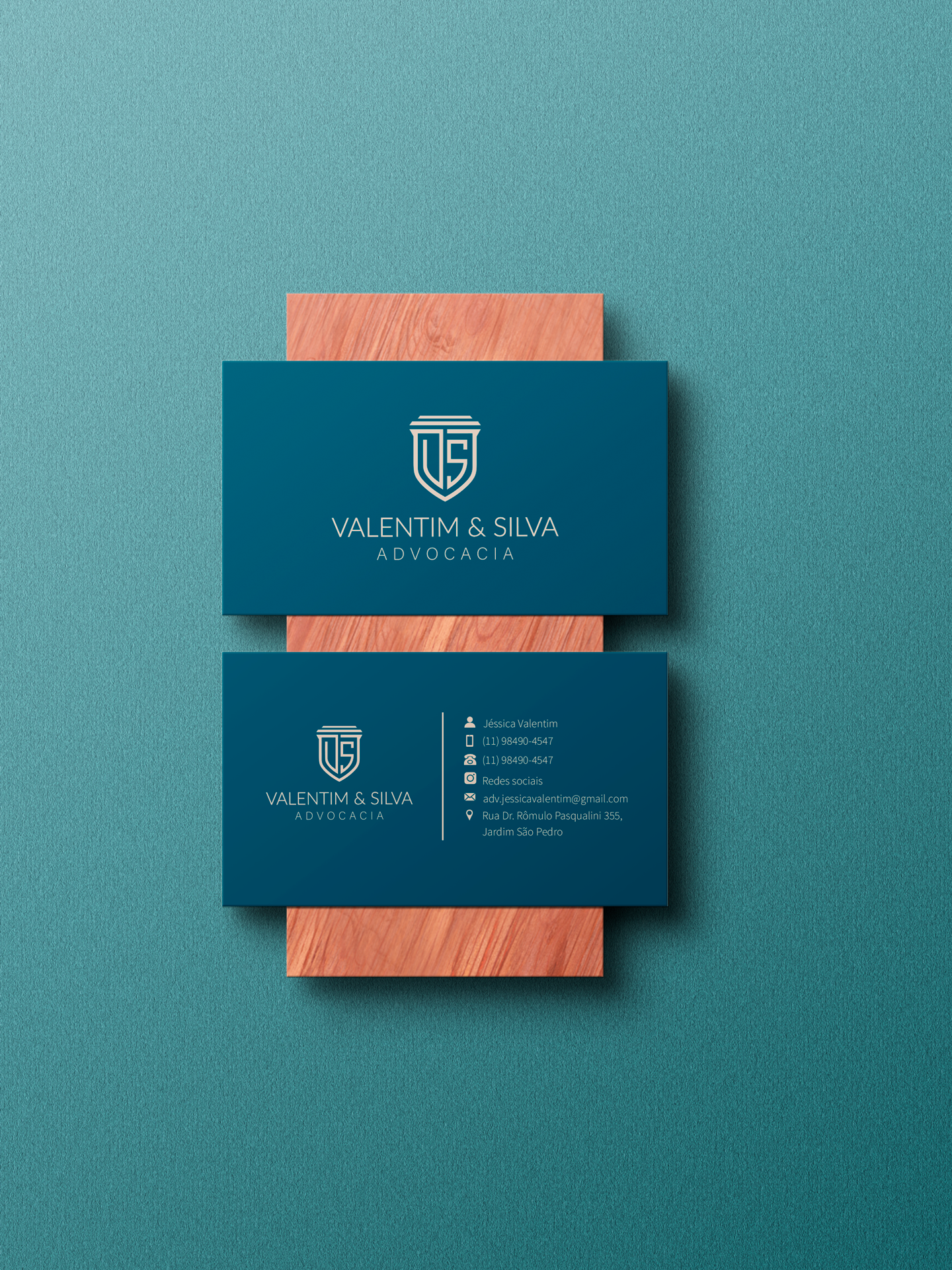 O símbolo criado para o logotipo representa um escudo, construído a partir da fusão das iniciais “V” e “S”. Essa forma transmite solidez e autoridade, reforçando a imagem de um escritório preparado para defender os interesses de seus clientes com firmeza e comprometimento. A escolha das formas e da composição visual foi pensada para comunicar seriedade, credibilidade e profissionalismo — pilares que sustentam a atuação do escritório.